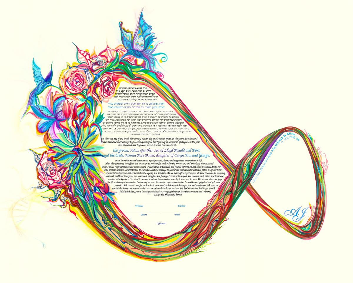 Infinite Floral and Ribbons Garland Ketubah is a giclee measuring 24" x 20" in the classic size by American artist, Nava Shoham. Bright and colorful bands form the infinity sign with flowers and ribbons. Hummingbirds hover over the beautiful flowers. Also available in large size (28" x 24") and small size (18" x 14"). Price includes personalization.